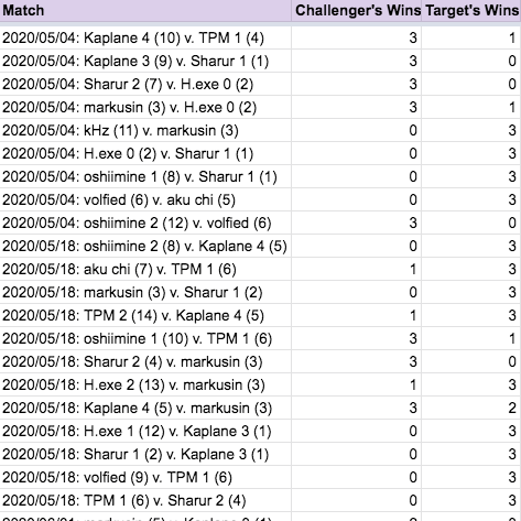 A while back, a number of us in the Dominion Discord community decided it would be fun to play some organized Smash Bros, as well. We created the Smash Ladder and I volunteered to handle the technical backend of things. We needed a system that would allow people to issue challenges to other players, submit match results, and rerank the players accordingly, all subject to a rather complex set of rules. I came up with a very complicated approach that modeled the expected behavior in a single massive formula. My friend Sam, when asked about it, was able to come up with a much simpler mathematical approach. (Benefits of having a degree in applied mathematics from MIT.) So that’s what we went with. It was still tricky to get Google Sheets to perform the calculations automatically and I’m proud of the solutions I came up with.